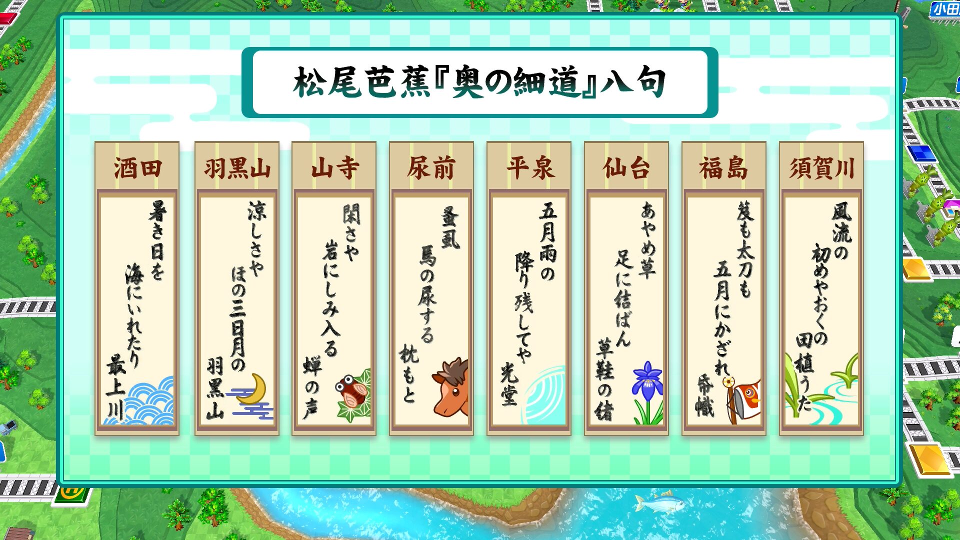 松尾芭蕉の俳句にちなんだマスに止まり、俳句を集めるイベントです。このイベントはいつもの桃鉄限定で、3年決戦では発生しません。