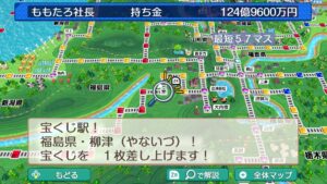 「桃太郎電鉄2 ~あなたの町も きっとある~ 東日本編+西日本編(桃鉄2)」でも、マップ上の数か所に宝くじ駅があり、当たれば思わぬ大金を手にすることができます。