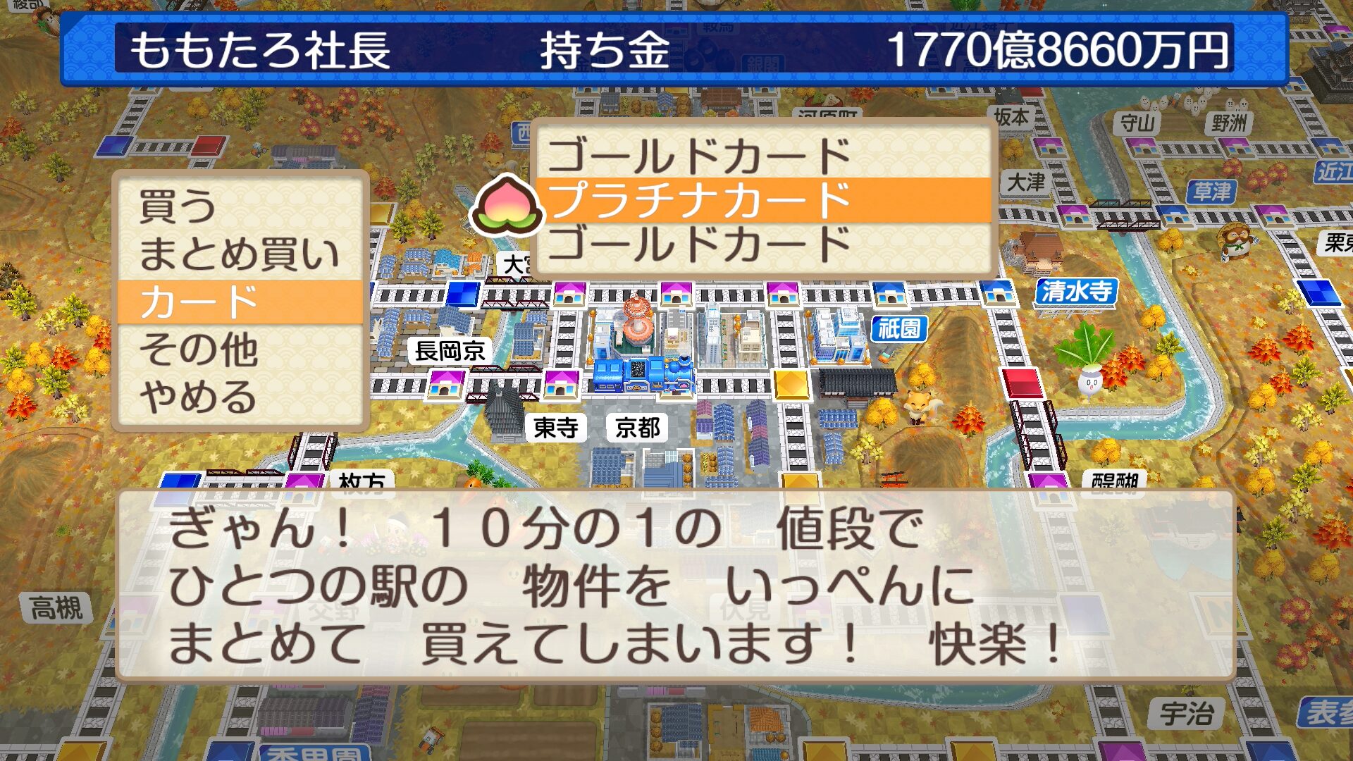 「桃太郎電鉄2 ~あなたの町も きっとある~(桃鉄2)」にも登場するプラチナカードは、ひとつの物件駅の物件すべてを10分の1の価格で購入できるカードです。