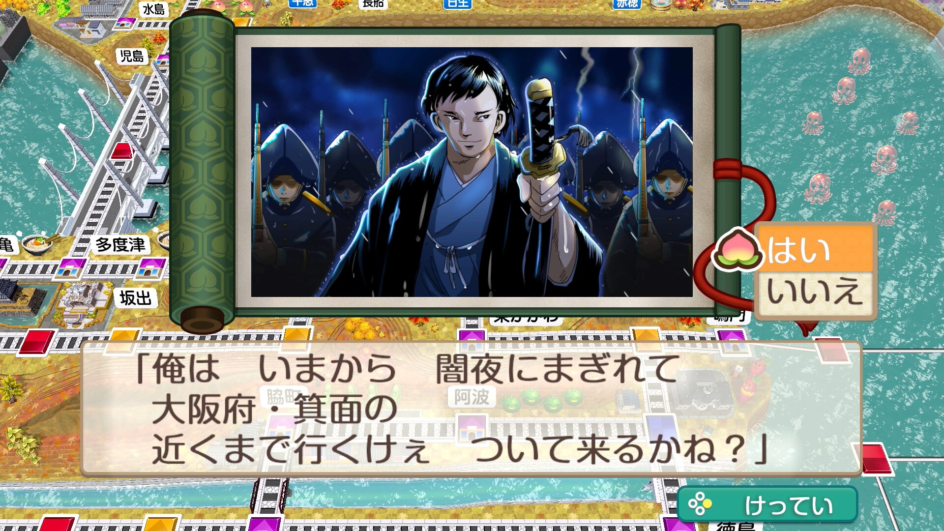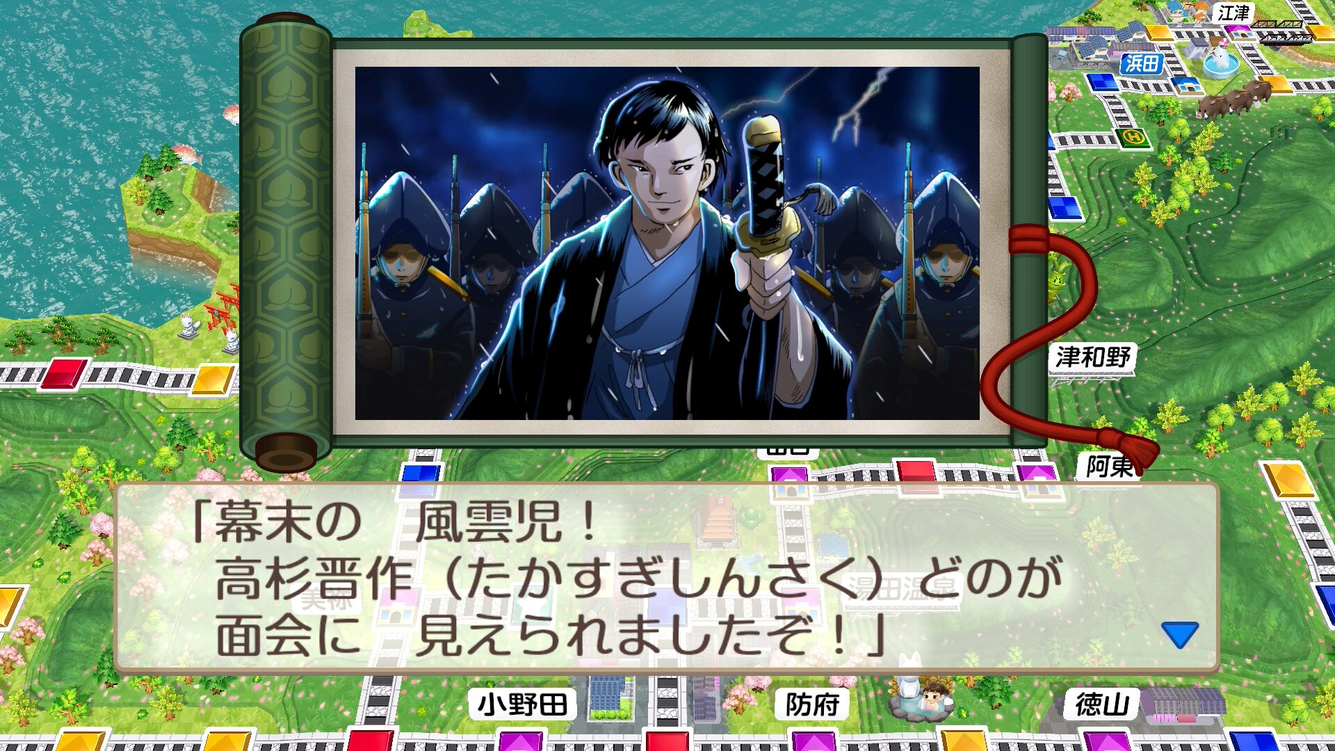 高杉晋作を仲間にしていると、目的地から離れているとき、確率で6マス以内まで連れていってくれます。仲間にしてしばらくの間は、イベントが高い確率で発生します。